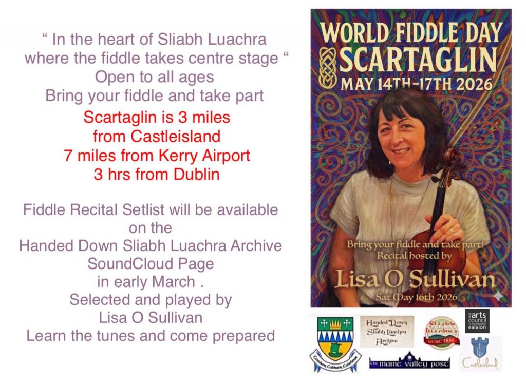 Lisa O Sullivan , one of our finest fiddle players in Sliabh Luachra will pick the tunes and host the 2026 World Fiddle Day Recital on Saturday May 16 – 2026